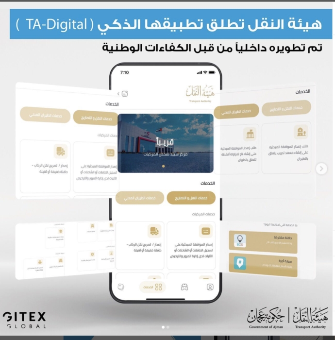 أعلنت هيئة النقل بعجمان عن اطلاق تطبيقها الذكي ( TA-Digital ) في متاجر التطبيقات الذكية ( ابل ستور و جوجل بلاي ) و ذلك في اطار تجربة مميزة و متكاملة للمتعاملين و تمكينهم من انجاز معاملتهم و خدماتهم في أي وقت و أي مكان، حيث يحتوى التطبيق على مجموعة من الخدمات الرقمية التي صممت وفقاً لمعايير الخدمة الحكومية المتميزة و تعزز رؤية امارة عجمان للتحول الرقمي الشامل .